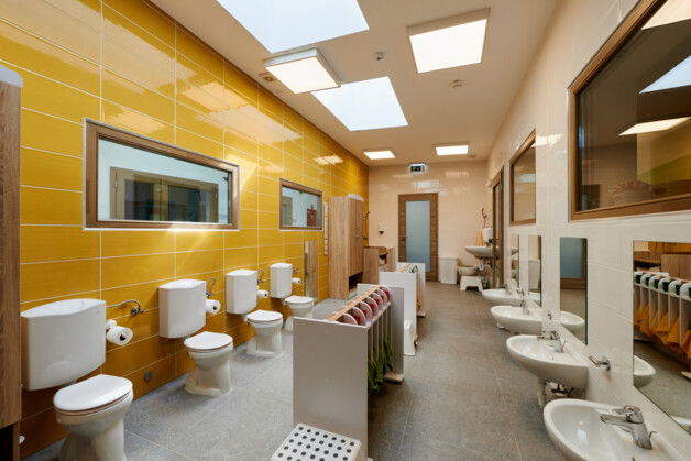 A homlokzatok játékos látszólag ad hoc méretű ablakokkal komponált megjelenése tovább erősíti a mesebeli képet, és azon kapjuk magunkat, hogy elgondolkozunk, miként fér majd be az a néhány felnőtt az épületbe, akik a gyerekekkel töltik a napot.